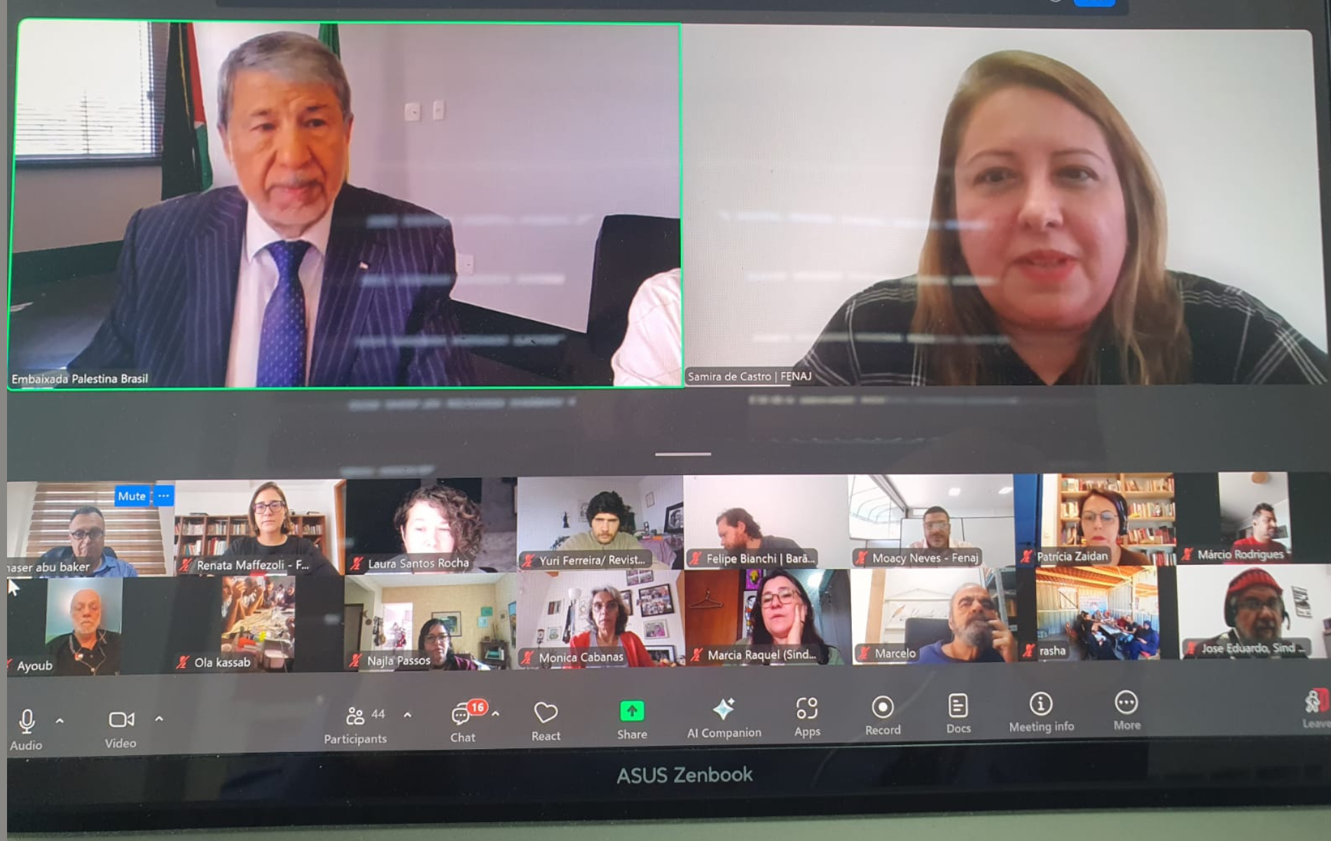 غزة 25-9-2025 وفا- شارك عشرات الصحفيين البرازيليين في فعالية تضامنية مع الصحفيين الفلسطينيين في قطاع غزة، نظمت عبر تقنية "زووم" بين اتحاد الصحفيين البرازيلي ونقابة الصحفيين الفلسطينيين، بحضور سفير دولة فلسطين لدى البرازيل إبراهيم الزبن.