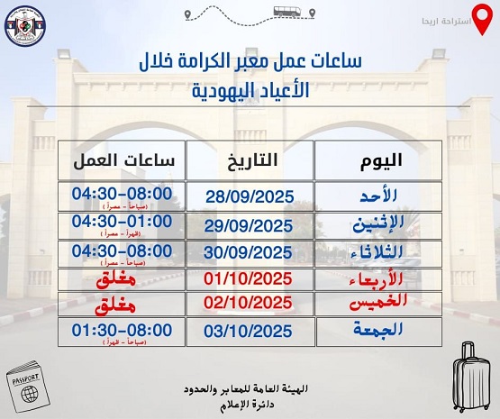 وفي وقت لاحق، أعلن مهنا عن تغييرات في ساعات عمل المعبر خلال الأسبوع المقبل بسبب الأعياد اليهودية، وفق الجدول التالي: