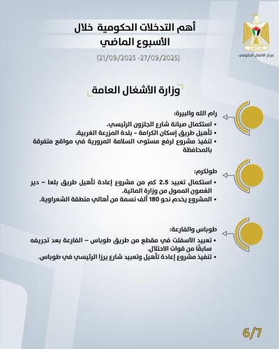 وأشار إلى أن وزارة الأشغال العامة استكملت أعمال صيانة شارع الجلزون الرئيسي وتأهيل طريق إسكان الكرامة في بلدة المزرعة الغربية، وتنفيذ مشروع لرفع مستوى السلامة المرورية في مواقع متفرقة بمحافظة رام الله والبيرة. كما استكملت تعبيد مقطع بطول 2.5 كم من مشروع إعادة تأهيل طريق بلعا– دير الغصون بمحافظة طولكرم الممول من وزارة المالية، ويخدم نحو 180 ألف نسمة من أهالي منطقة الشعراوية. كذلك تم تعبيد مقطع من طريق طوباس– الفارعة بعد أن جَرَّفته قوات الاحتلال، إلى جانب تنفيذ مشروع إعادة تأهيل وتعبيد شارع طوباس– الدير– عينون (طريق يرزا) الذي يُعد ممرًا رئيسيًا يربط المنطقة بمدينة طوباس.