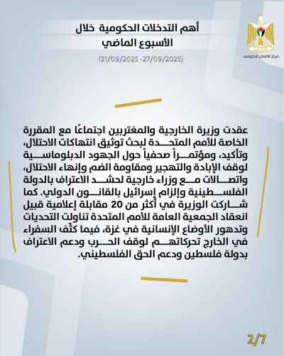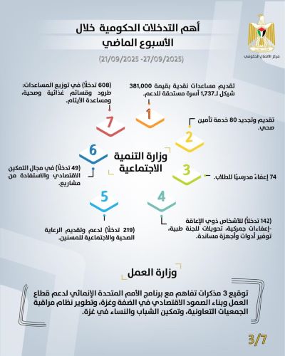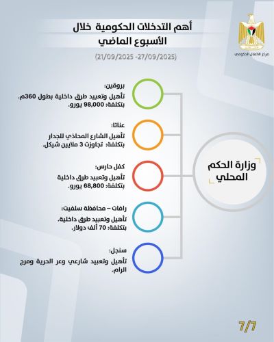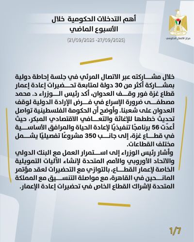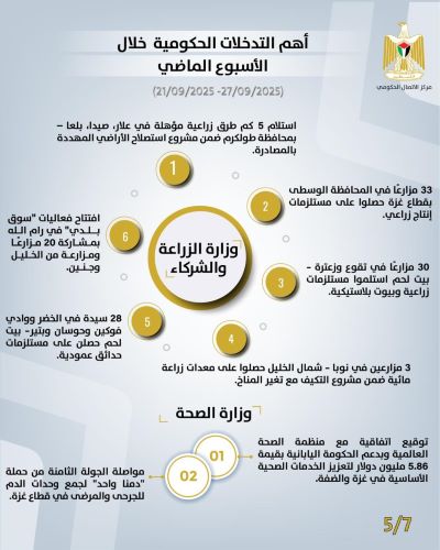 رام الله 28-9-2025 وفا- أصدر مركز الاتصال الحكومي تقريرا يُبرز أهم التدخلات التنموية والإصلاحية التي نَفَّذَتها الحكومة الفلسطينية، خلال الأسبوع الماضي (21/09/2025 – 27/09/2025).