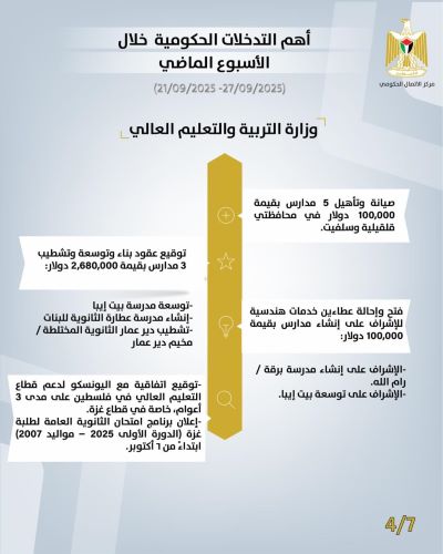 وأتمَّت وزارة التربية والتعليم العالي صيانة وتأهيل 5 مدارس بتمويل الرؤيا العالمية بقيمة 100,000 دولار (كفر قدوم/ قلقيلية، كفل حارس، مسحة، قيرة الثانوية المختلطة، سرطة الأساسية المختلطة/ سلفيت)، ووقَّعت عقود بناء وتوسعة وتشطيب 3 مدارس بواقع 16 غرفة صفيَّة وصفّي روضة بقيمة 2,680,000 دولار (بيت إيبا، عطارة الثانوية للبنات، دير عمار الثانوية المختلطة)، وأحالت عطاءين لخدمات هندسية للإشراف على مدارس بقيمة 100,000دولار (برقة/ رام الله، توسعة بيت إيبا). كما وقّع الوزير مع ممثلة اليونسكو اتفاقية لدعم التعليم العالي خاصة في غزة، وأعلنت الوزارة عن منح دراسية في تركيا 2025-2026، وبرنامج امتحان الثانوية العامة في غزة (الدورة الأولى 2025– مواليد 2007) المقرر في 6 أكتوبر.