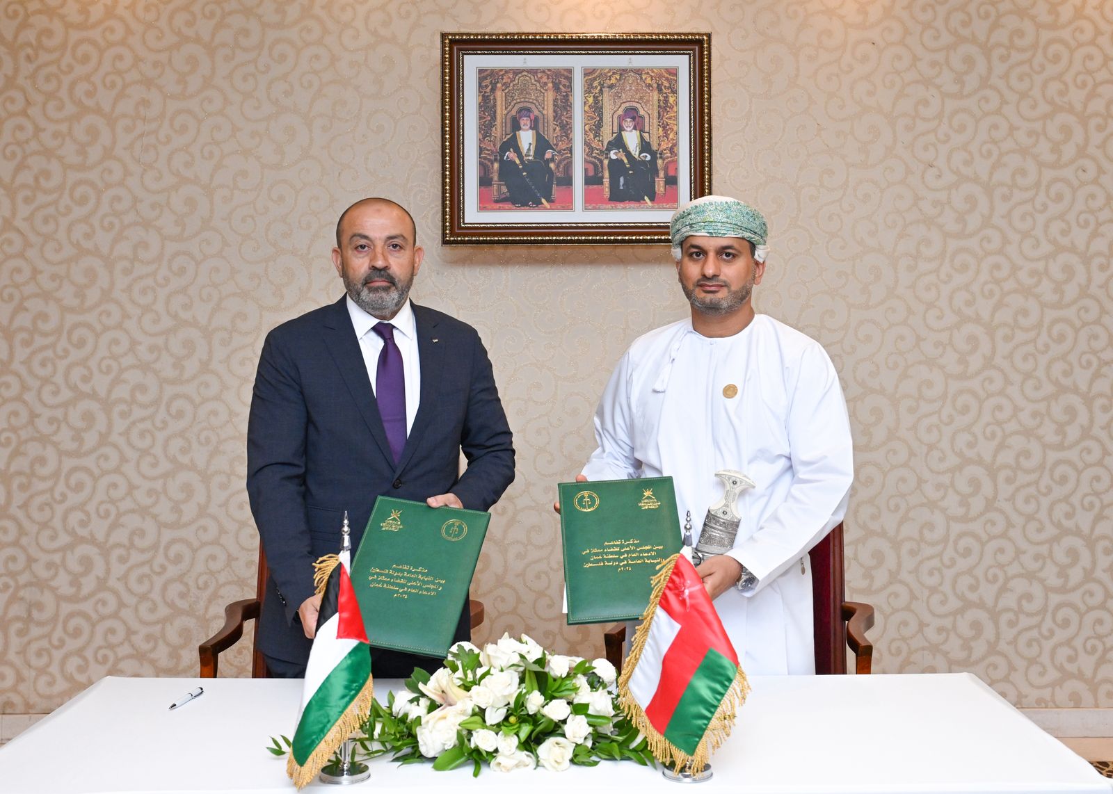 مسقط 3-9-2025 وفا- وقّعت النيابة العامة لدولة فلسطين، ممثلة بالنائب العام المستشار أكرم الخطيب، مذكرة تفاهم مع الادعاء العام في سلطنة عُمان الشقيقة، ممثلاً بالمدعي العام نصر بن خميس الصواعي، وذلك على هامش الاجتماع السنوي الخامس لجمعية النواب العموم العرب المنعقد في محافظة ظفار بسلطنة عُمان.