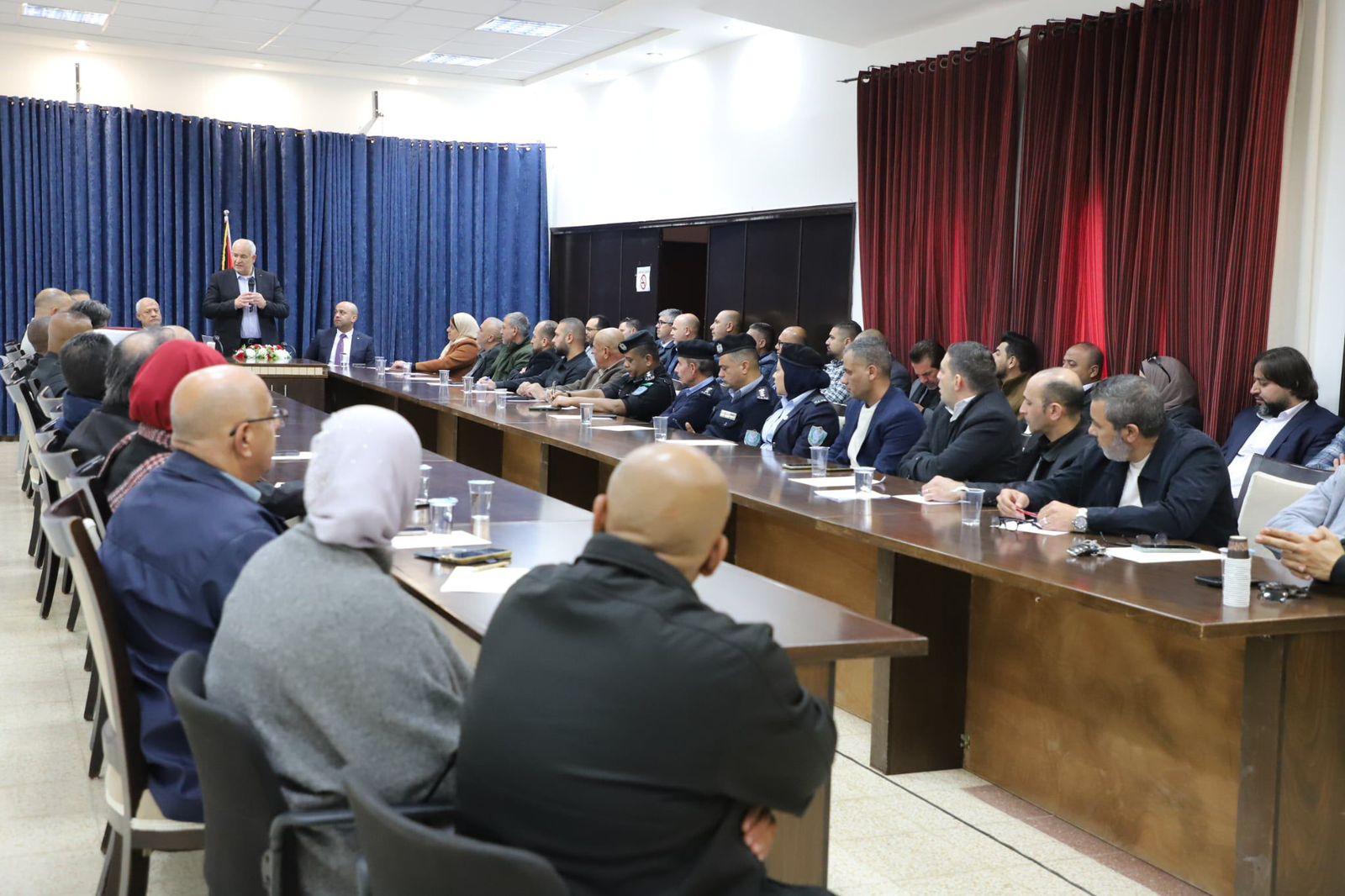 أريحا 11-1-2026 وفا- اجتمع وزير الداخلية زياد هبّ الريح، اليوم الأحد، مع محافظ أريحا والأغوار حسين حمايل، وقادة المؤسسة الأمنية، ومديري المؤسسات الحكومية والأهلية والخاصة، وممثلي الهيئات المحلية في مقر محافظة أريحا، لبحث الأوضاع العامة في المحافظة، والتأكيد على أهمية تماسك المؤسسات ومواصلة أداء واجباتها في ظل الظروف الصعبة.