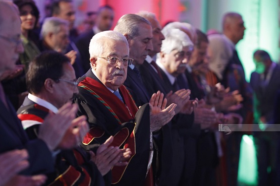كما أتوجه لهذه الجامعة الفتية الصاعدة بجزيل شكري على قرارها منحي شهادة الدكتوراة الفخرية في العلوم الإنسانية، والتي أعتبرها وساماً عزيزاً نضعه سوياً على صدر شعبنا الفلسطيني الصابر الصامد، هذا الشعب الذي جعل فلسطين العلم والمعرفة والإبداع وجهاً آخر لفلسطين الدولة الحرة الديمقراطية.