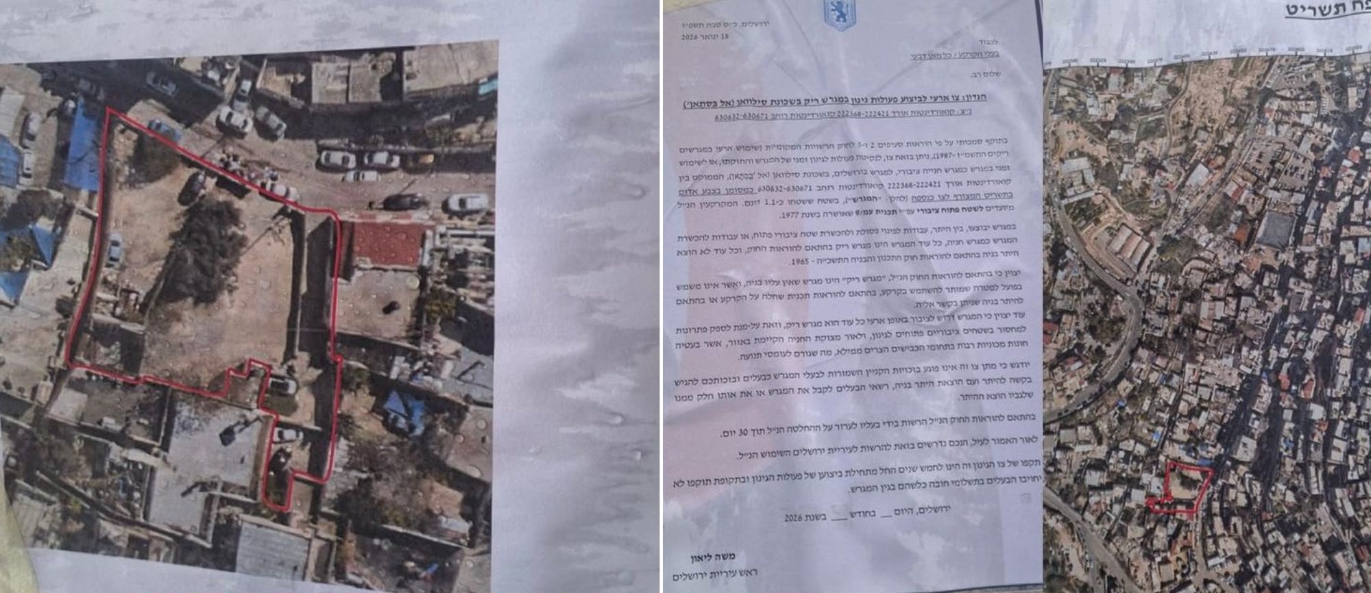 القدس 18-1-2026 وفا- أخطرت بلدية الاحتلال الإسرائيلي في القدس، اليوم الأحد، أهالي حي البستان في بلدة سلوان بنيتها الاستيلاء على دونم و100 متر من أراضي الحي، بذريعة إقامة مشروع "تنسيق حدائق ومواقف سيارات".