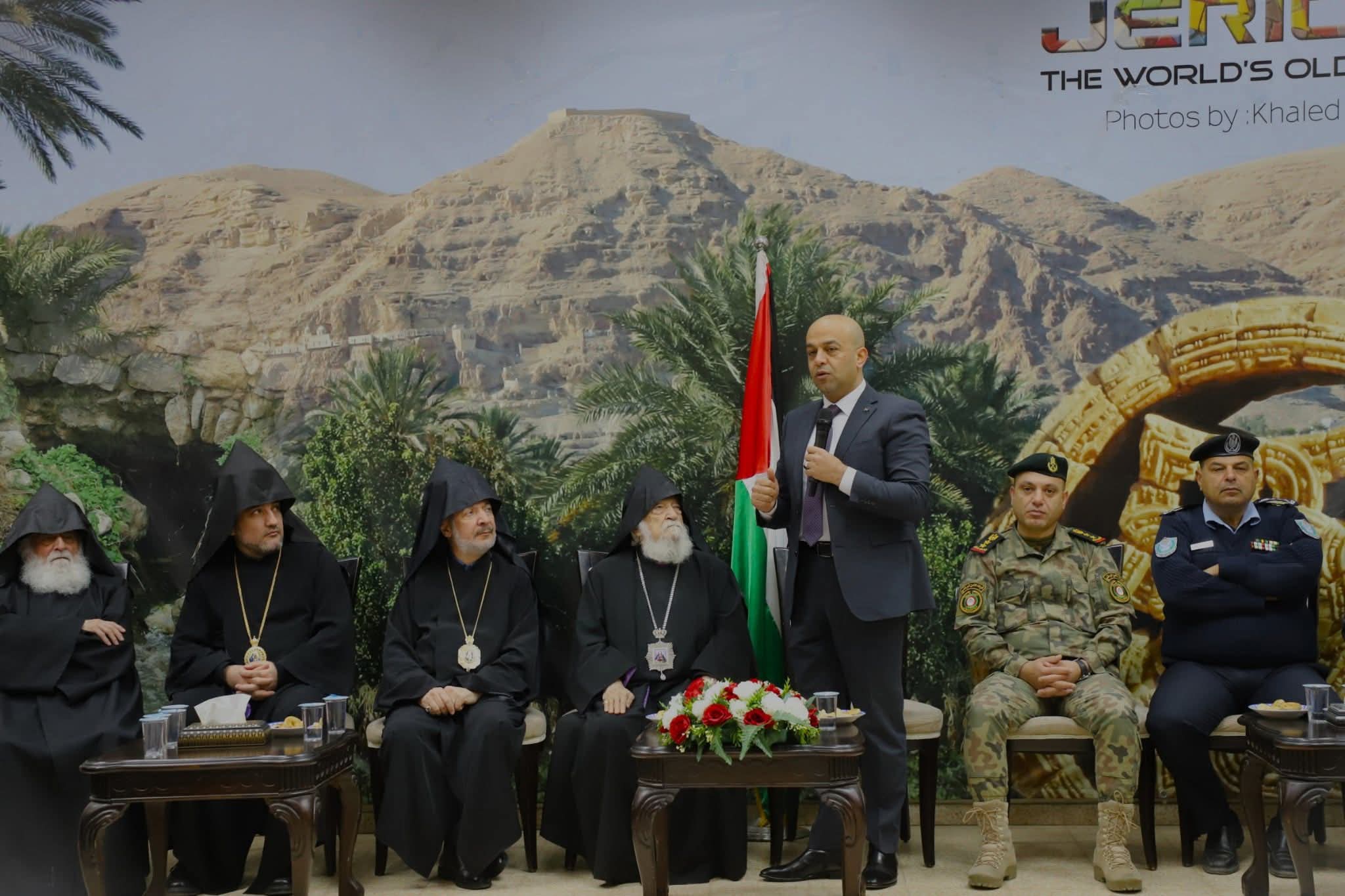 جاء ذلك خلال استقباله بمقر المحافظة، اليوم السبت، النائب البطريركي للأرمن الأرثوذكس في القدس والديار المقدسة والأردن المطران سيفان غاريبيان والوفد المرافق له، بحضور وفد من رجال الدين المسيحي وقادة الأجهزة الأمنية ورئيس الغرفة التجارية والمؤسسات المدنية والأهلية وبلدية أريحا والمتقاعدين العسكريين المدنيين وفعاليات المحافظة.