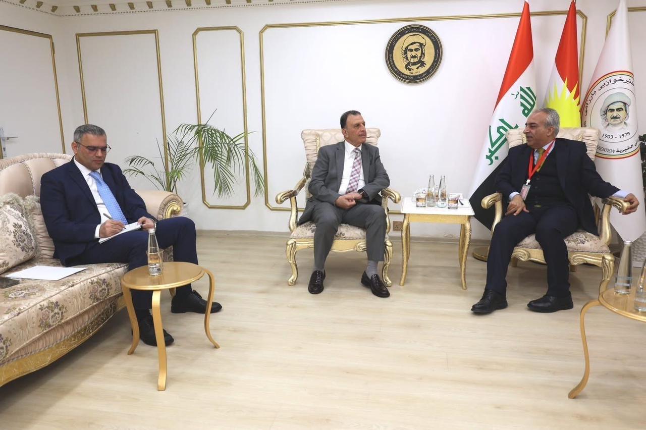 أربيل 5-1-2026 وفا- بحث القنصل العام لدولة فلسطين في أربيل السفير ماهر الكركي، اليوم الاثنين، مع رئيس مؤسسة بارزاني الخيرية موسى أحمد، عددًا من القضايا ذات الاهتمام المشترك، وفي مقدمتها الأوضاع المعيشية والاجتماعية لأبناء الجالية الفلسطينية المقيمة في إقليم كوردستان، إلى جانب سبل تعزيز التعاون المشترك، وإرسال قوافل مساعدات إنسانية وإغاثية عاجلة إلى أبناء الشعب الفلسطيني في قطاع غزة.