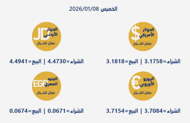رام الله 8-1-2026 وفا- جاءت أسعار صرف العملات مقابل الشيقل الإسرائيلي، اليوم الخميس، بحسب سلطة النقد الفلسطينية، على النحو التالي: