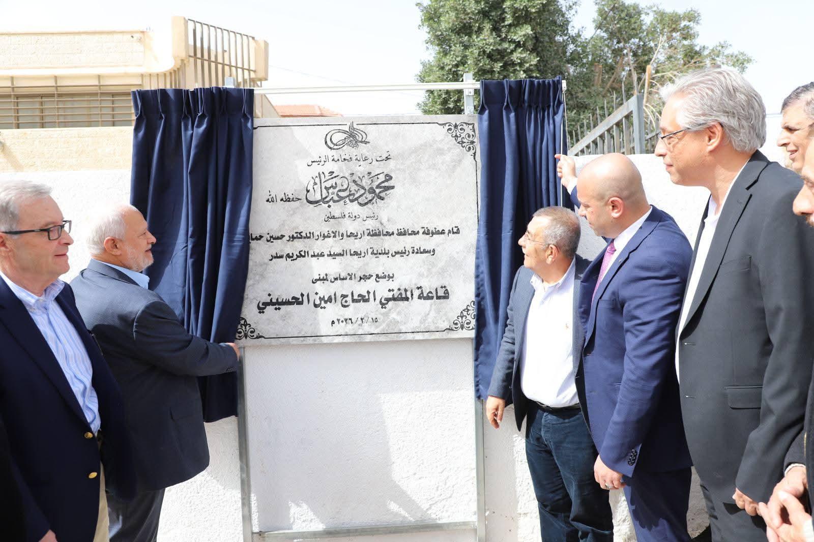 أريحا 15-2-2026 وفا- تحت رعاية رئيس دولة فلسطين، محمود عباس، وضع محافظ أريحا والأغوار، حسين حمايل، ورئيس بلدية أريحا، عبد الكريم سدر، اليوم الأحد، حجر الأساس لمبنى قاعة المفتي الحاج أمين الحسيني متعددة الاستخدامات.