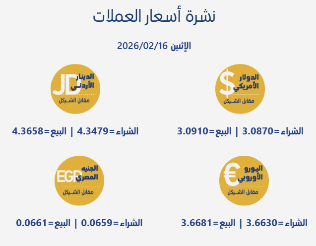 رام الله 16-2-2026 وفا- جاءت أسعار صرف العملات مقابل الشيقل الإسرائيلي، اليوم الإثنين، بحسب سلطة النقد الفلسطينية، على النحو التالي: