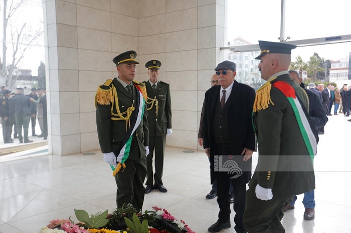 رام الله 20-3-2026 وفا- وضع وفد من فصائل منظمة التحرير الفلسطينية، اليوم الجمعة، إكليلا من الزهور على ضريح الرئيس الشهيد ياسر عرفات، بمقر الرئاسة في مدينة رام الله، لمناسبة عيد الفطر المبارك.