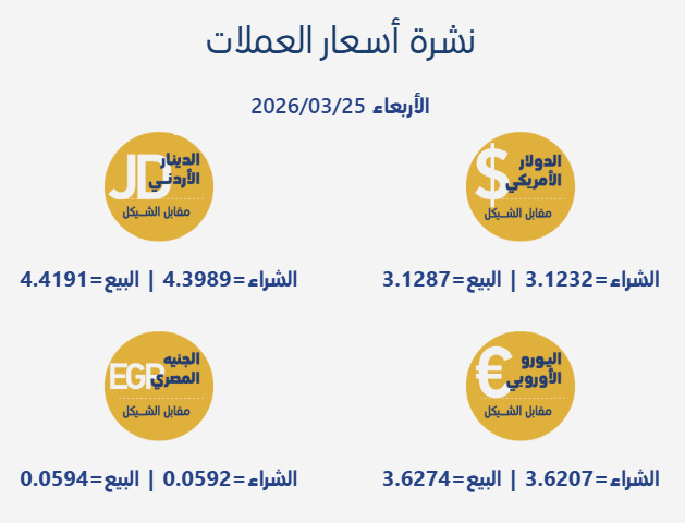 رام الله 25-3-2026 وفا- جاءت أسعار صرف العملات مقابل الشيقل الإسرائيلي، اليوم الأربعاء، بحسب سلطة النقد الفلسطينية، على النحو التالي: