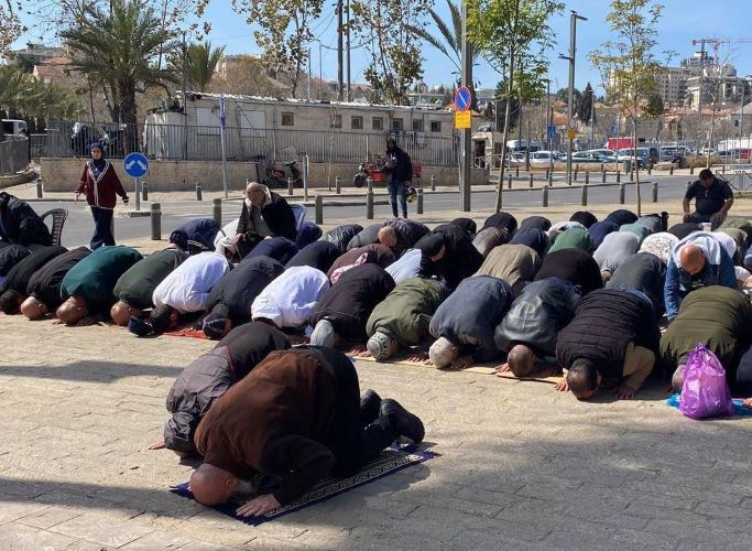 مواطنون يؤدون الصلاة في الشارع بعد منعهم من دخول المسجد الأقصى