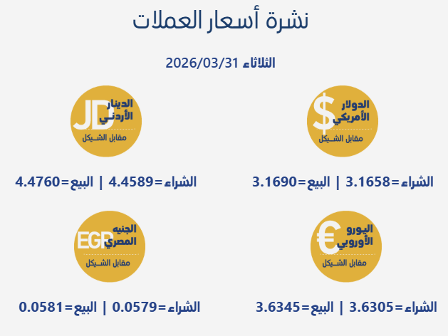 رام الله 31-3-2026 وفا- جاءت أسعار صرف العملات مقابل الشيقل الإسرائيلي، اليوم الثلاثاء، بحسب سلطة النقد الفلسطينية، على النحو التالي: