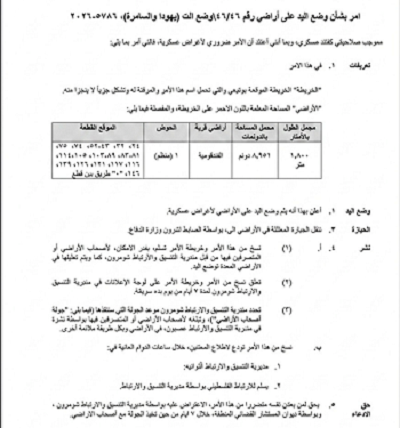 وأفادت مصادر محلية بأن الإخطار يشمل نحو 8,950 مترًا مربعًا من أراضي القرية.
