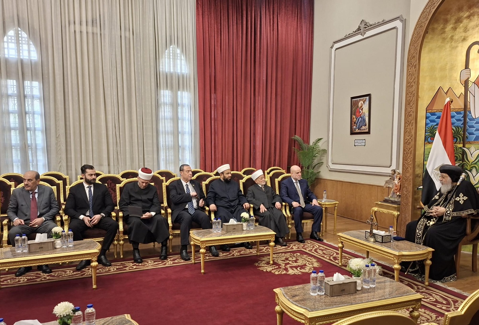 القاهرة 2-4-2026 وفا- بحث وفد من القيادات الدينية الفلسطينية برئاسة قاضي قضاة فلسطين، مستشار الرئيس للشؤون الدينية والعلاقات الإسلامية محمود الهباش، ومفتي فلسطين الشيخ محمد حسين، ووزير الأوقاف والشؤون الدينية محمد نجم مع البابا تواضروس الثاني بابا الإسكندرية وبطريرك الكرازة المرقسية، في مقر الكنيسة القبطية الأرثوذكسية في العاصمة المصرية، القاهرة، الأوضاع التي تعيشها القدس المحتلة في ظل التصعيد الإسرائيلي المستمر، والحصار المفروض على المقدسات الدينية، وعلى رأسها المسجد الأقصى وكنيسة القيامة، وإغلاقهما أمام المصلين منذ أكثر من شهر بذريعة الحرب.