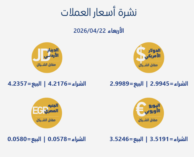 رام الله 22-4-2026 وفا- جاءت أسعار صرف العملات مقابل الشيقل الإسرائيلي، اليوم الأربعاء، بحسب سلطة النقد الفلسطينية، على النحو التالي: