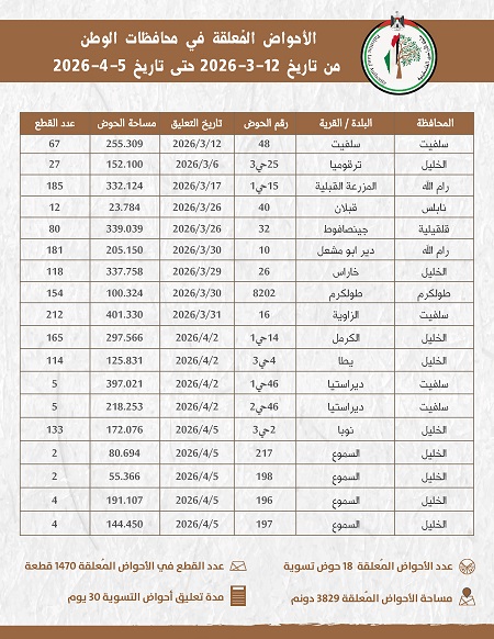 وأوضحت سلطة الأراضي أن الأحواض المعلّقة شملت محافظات سلفيت، والخليل، ورام الله والبيرة، ونابلس، وقلقيلية، وطولكرم، بمساحة إجمالية بلغت 3829 دونماً، وتضم ما مجموعه 1470 قطعة أرض، وذلك في إطار إتاحة المجال أمام المواطنين للاطلاع على جداول الحقوق ومراجعتها وفق الإجراءات القانونية.