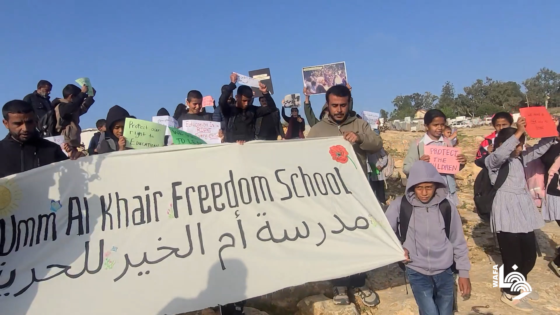 أطفال أم الخير يحتجون على إغلاق طريق مدرستهم